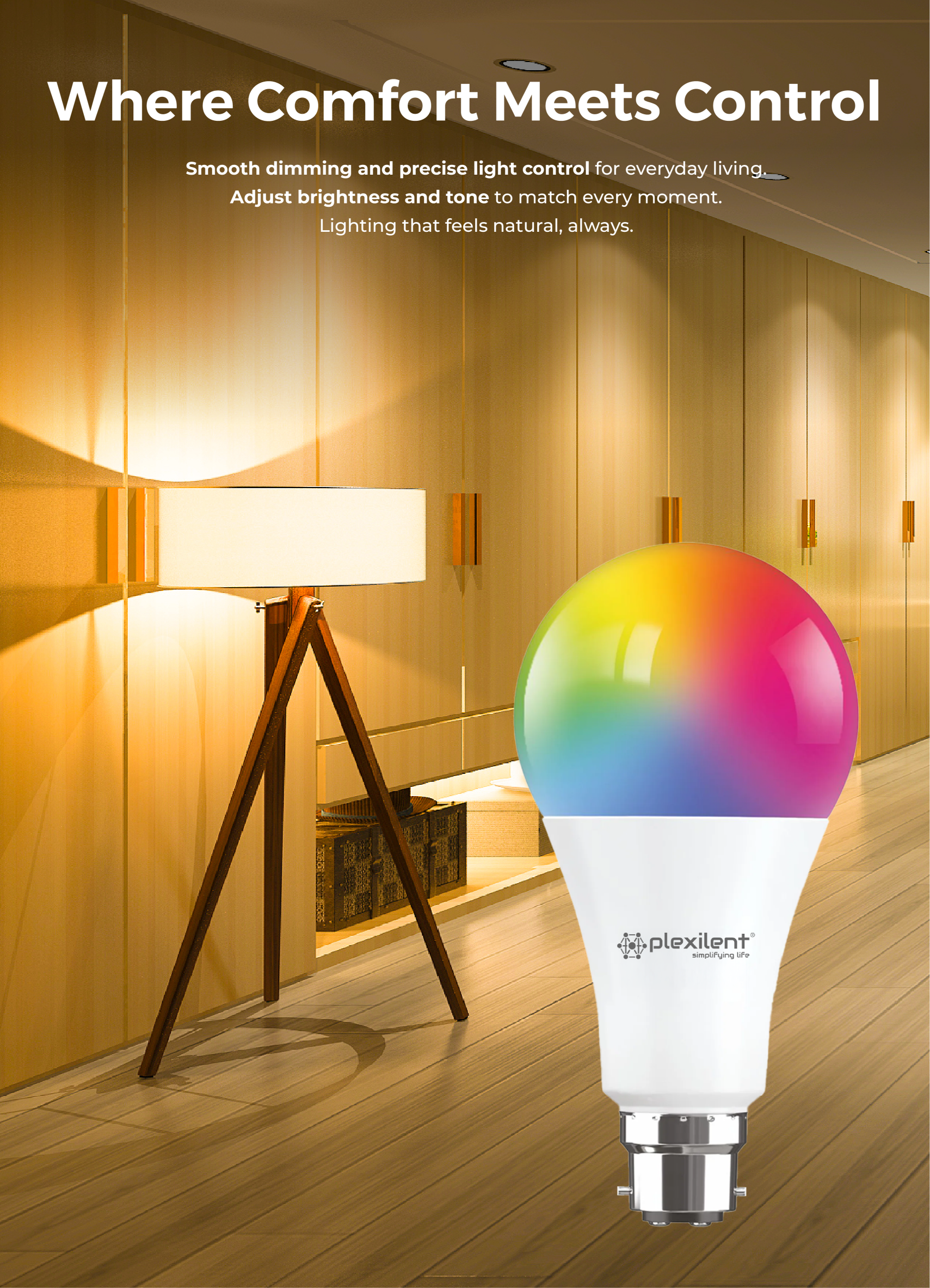 The Plexilent Smart Light Bulb pairs with the Plexilent Lite App for easy dimming and color control, plus schedules, groups, and scenes. It also supports bio rhythm, last power memory, and music mode.